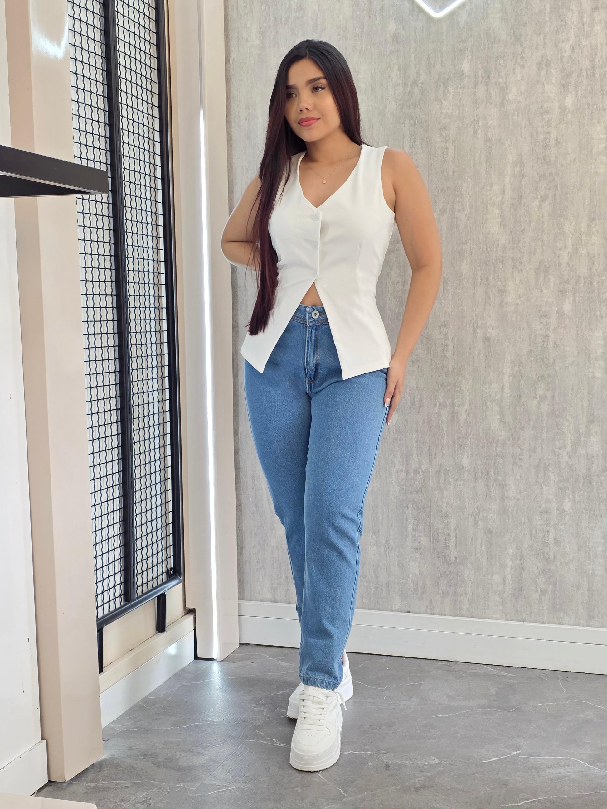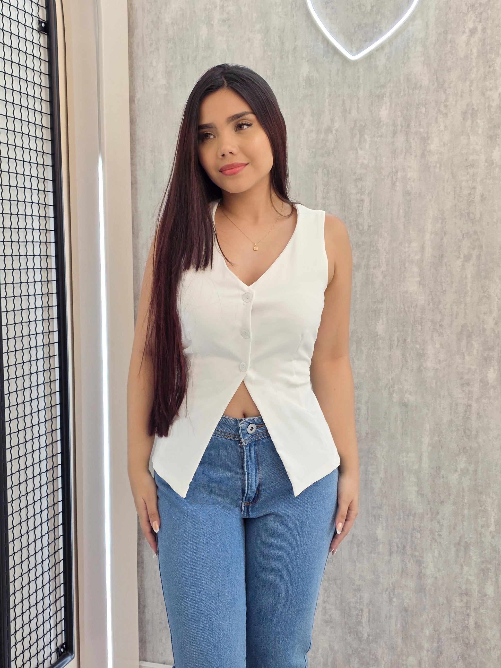 Chaleco largo, sin mangas y de silueta recta. Su diseño ligero y versátil lo convierte en una prenda ideal para complementar tus outfits del día a día.