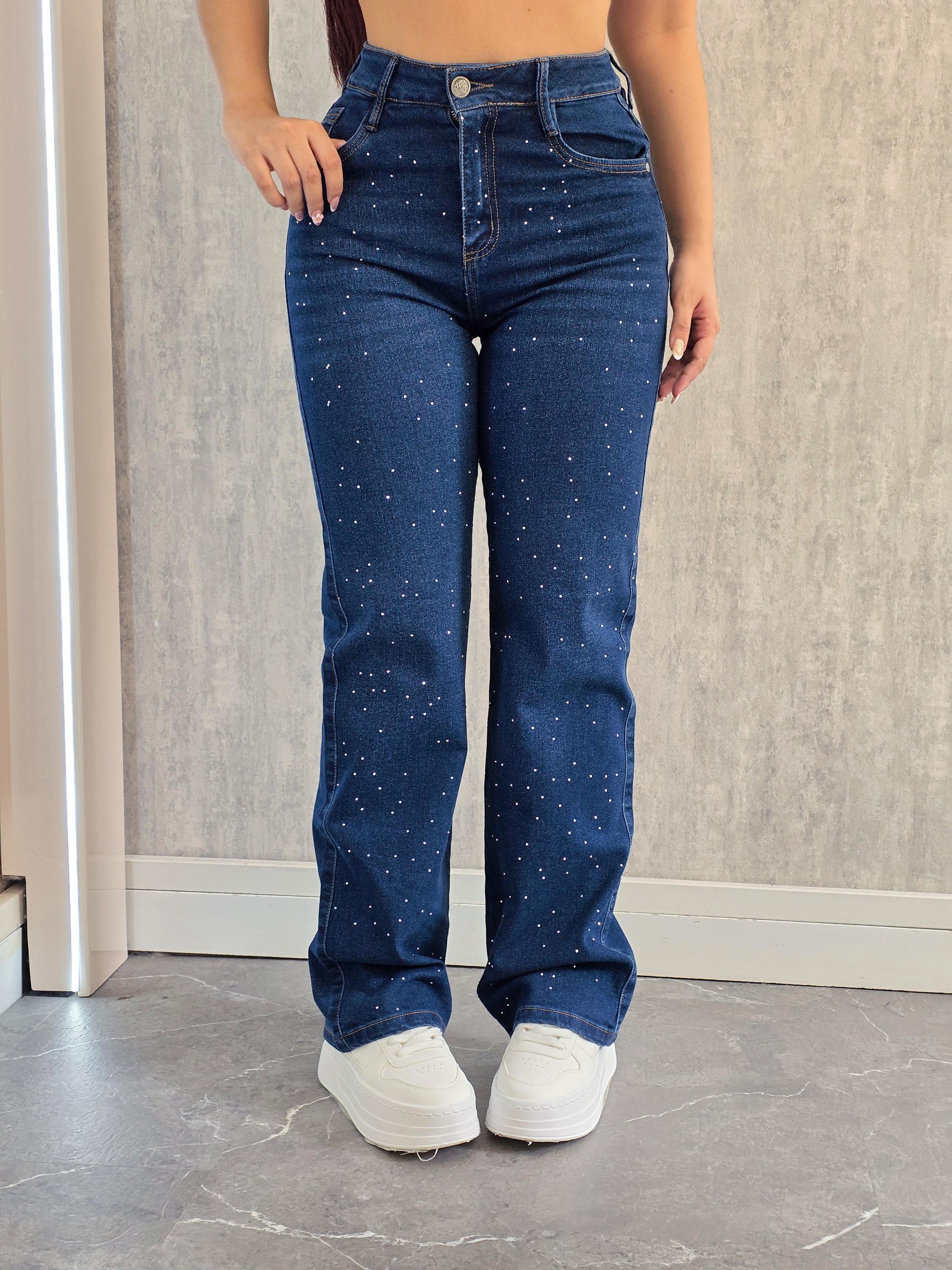 Dale un giro a tu look con nuestro jean de brillos, disponible en tono claro y oscuro.